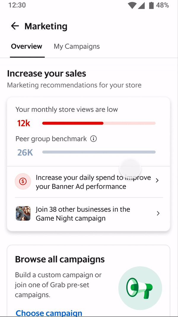 During my time at Grab, I focused on designing better ways for merchant partners to showcase their offerings, helping them grow their businesses while serving their customers more effectively. My work combined product design with field research and strategy planning, resulting in a marketing platform tailored to both long-tail and enterprise merchants. This led to the creation of features across both the Grab app and merchant web portal, grounded in real-world observations and user needs.